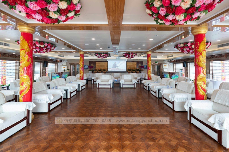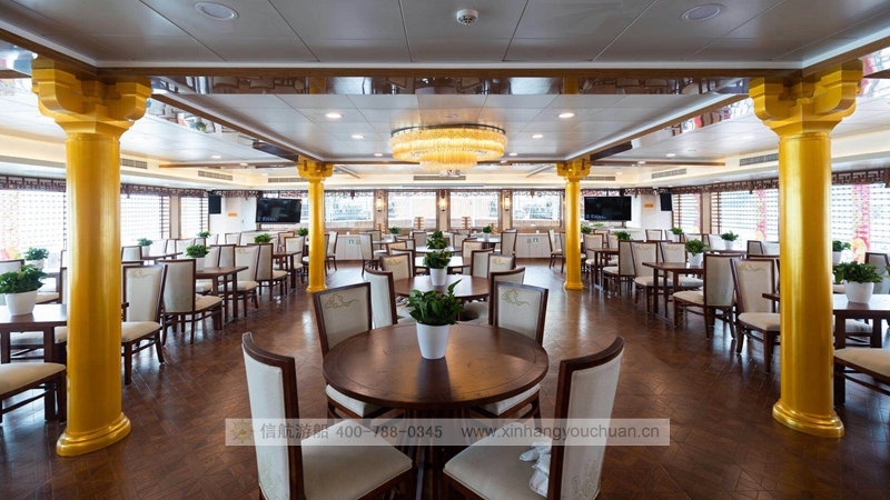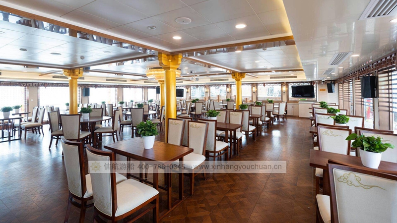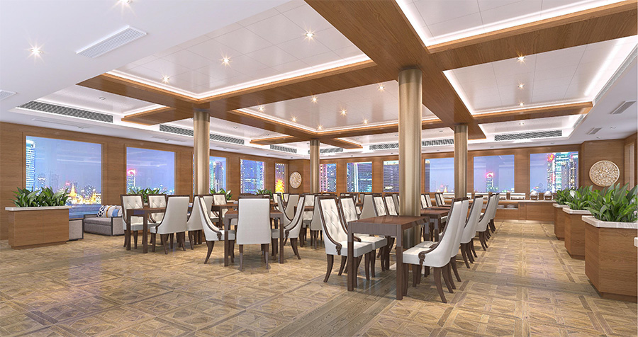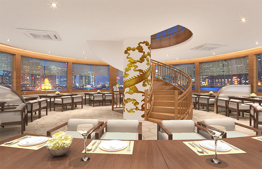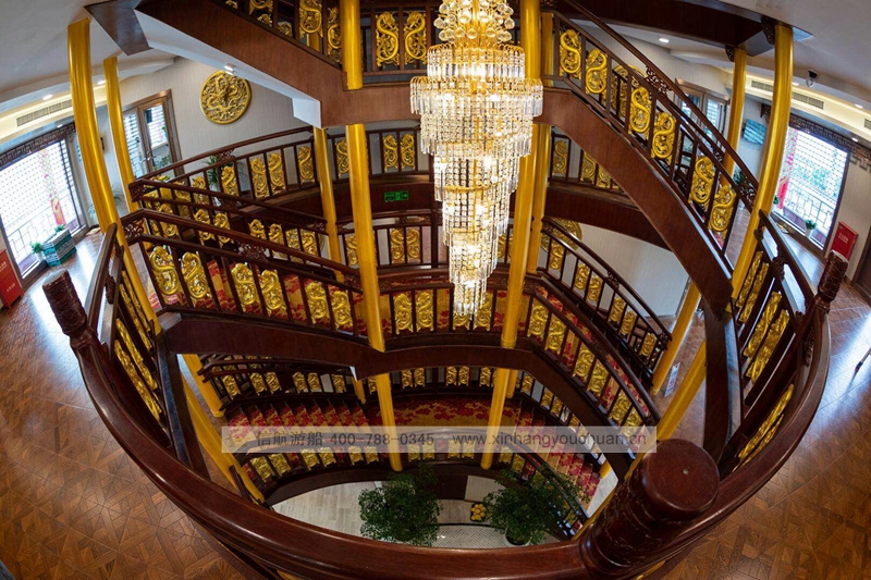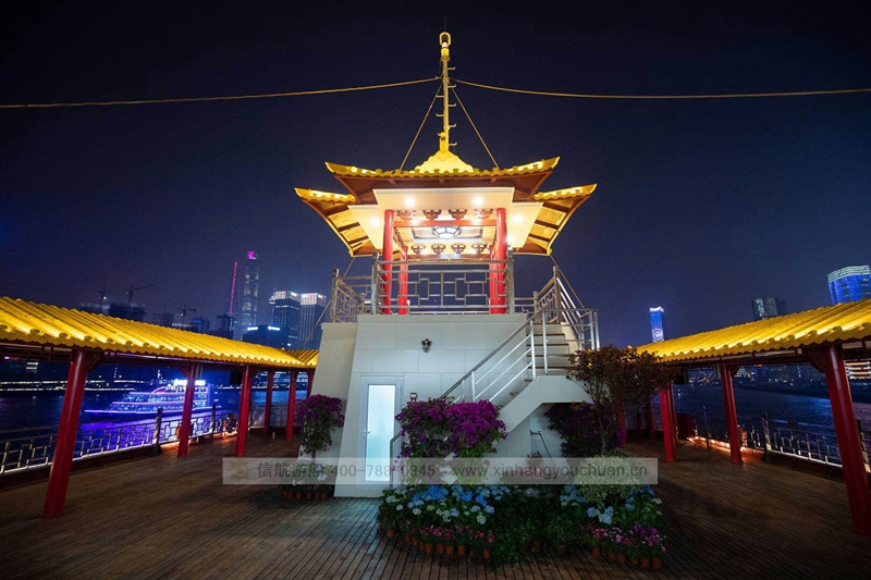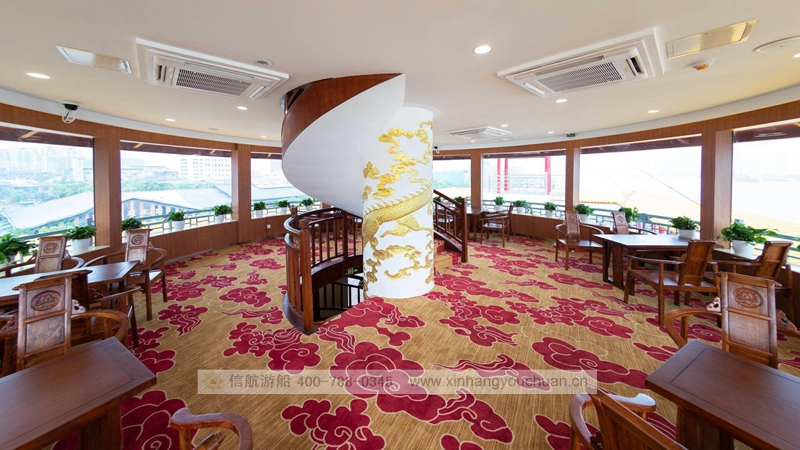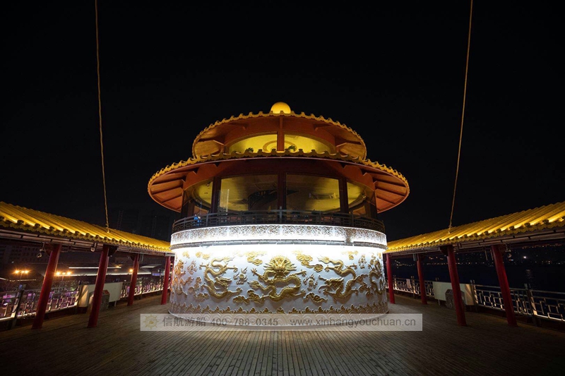 浦江游览1号“龙船”,传承了老龙船的精气神韵。传统的设计理念与现代的科技成就了新龙船的宏伟。整个游船采金色祥龙为设计基础,腾空出水的祥龙引领着游船奋勇前进。栩栩如生的龙身合围四层船身,龙身鳞片以薄铜片制成,在阳光下熠熠生辉,夜幕中以彩灯点缀,活灵活现。甲板上层建筑不仅有中国传统的亭台楼阁造型,还有烽火台、祈年殿等建筑。全船装饰上采用中国风设计理念,朱红廊柱、雕栏画栋、木雕格门窗,大型木雕“龙腾四海”及其他各类木雕数十处,为游船注入了浓厚的文化氛围,充分弘扬中华民族传统文化的精髓,古朴又不失宏伟、古典又不失精致,体现了中华文明的魅力,同时为黄浦江游览增添了一道靓丽的景观。让每一位游客在畅游浦江,欣赏着外滩的万国建筑博览群和与之遥相辉映的浦东陆家嘴现代建筑,同时品味着游船上浓浓的中国传统建筑和装饰的精华。现代的灯光技术装饰的祥龙精神奕奕,整个游船更显华贵典雅。