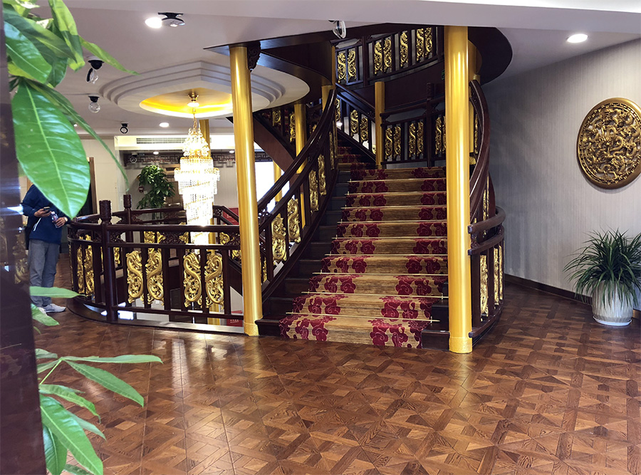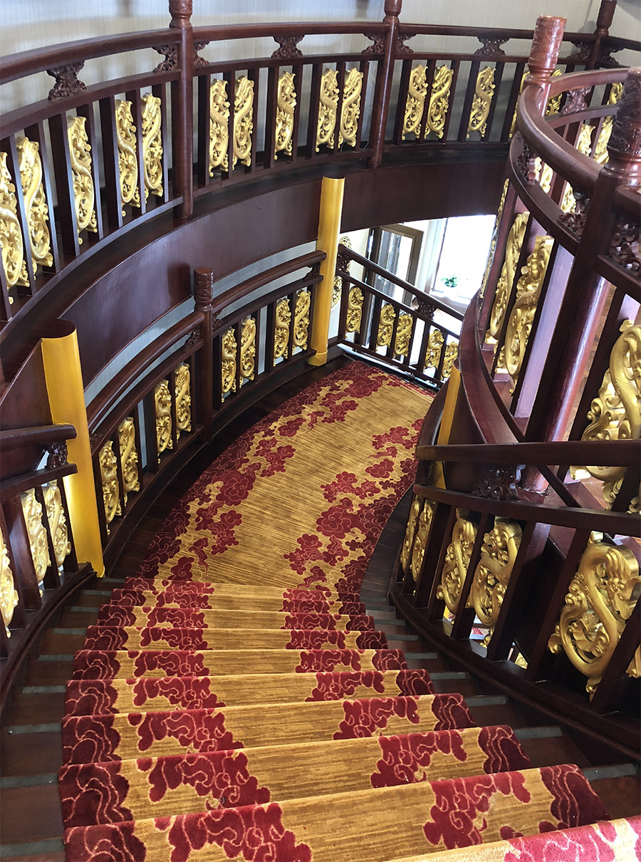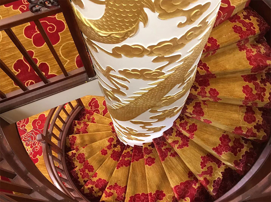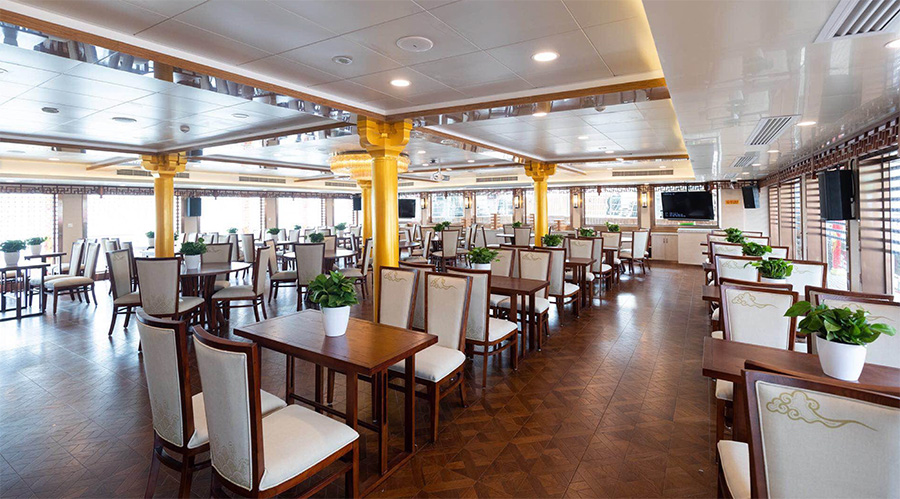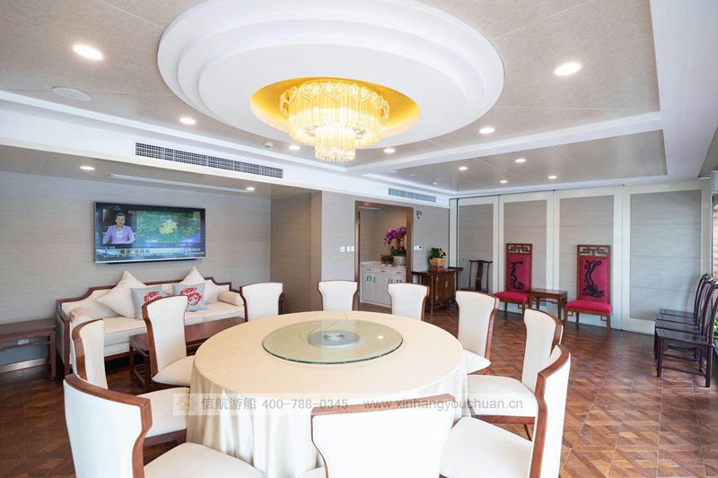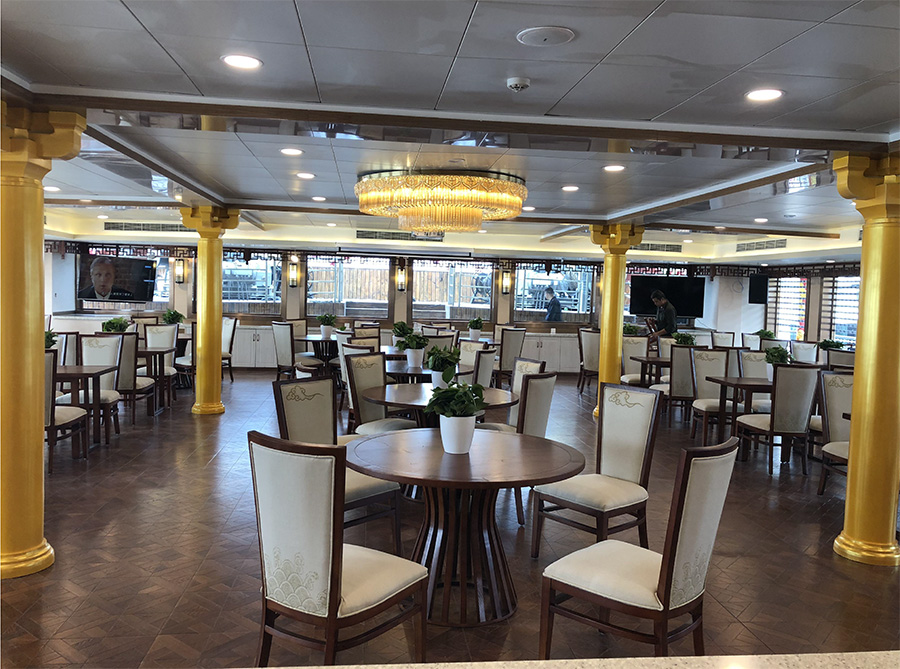 浦江游览1号“龙船”,传承了老龙船的精气神韵。传统的设计理念与现代的科技成就了新龙船的宏伟。整个游船采金色祥龙为设计基础,腾空出水的祥龙引领着游船奋勇前进。栩栩如生的龙身合围四层船身,龙身鳞片以薄铜片制成,在阳光下熠熠生辉,夜幕中以彩灯点缀,活灵活现。甲板上层建筑不仅有中国传统的亭台楼阁造型,还有烽火台、祈年殿等建筑。全船装饰上采用中国风设计理念,朱红廊柱、雕栏画栋、木雕格门窗,大型木雕“龙腾四海”及其他各类木雕数十处,为游船注入了浓厚的文化氛围,充分弘扬中华民族传统文化的精髓,古朴又不失宏伟、古典又不失精致,体现了中华文明的魅力,同时为黄浦江游览增添了一道靓丽的景观。让每一位游客在畅游浦江,欣赏着外滩的万国建筑博览群和与之遥相辉映的浦东陆家嘴现代建筑,同时品味着游船上浓浓的中国传统建筑和装饰的精华。现代的灯光技术装饰的祥龙精神奕奕,整个游船更显华贵典雅。