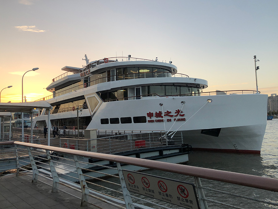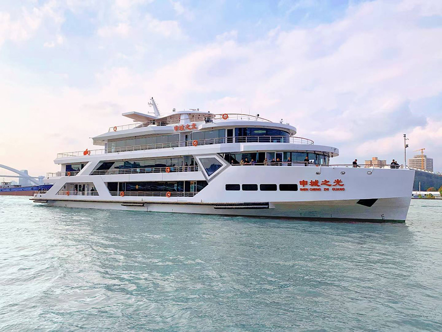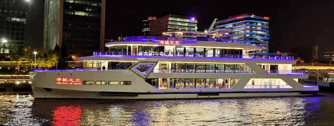 浦江游览”申城之光”游览船,设计方案以人性化的概念为基本前提,体验出人文和生态的统 一。把有限的空间面积设计出更大的空间感觉。“申城之光”设计按照美观、安全、创新、环保的设计原 则,具有典型政府接待船端庄大气,朴素典雅等特点,并配之新中式的屏风,窗棂,新中式简约造型,工 艺隔断等。通过这种新的分割方式既显得又层次,又方便使用,并使整体的感觉更加丰富,大而不空,厚 而不重,有格调有不嫌压抑。具有安全可靠、环保实用的功能。在材料使用上运用新工艺,新技术,新型 环保材料进行实施,并配置高科技的声光电等现代设备来营造视听效果。确保做出一个完全不同的新型游船。