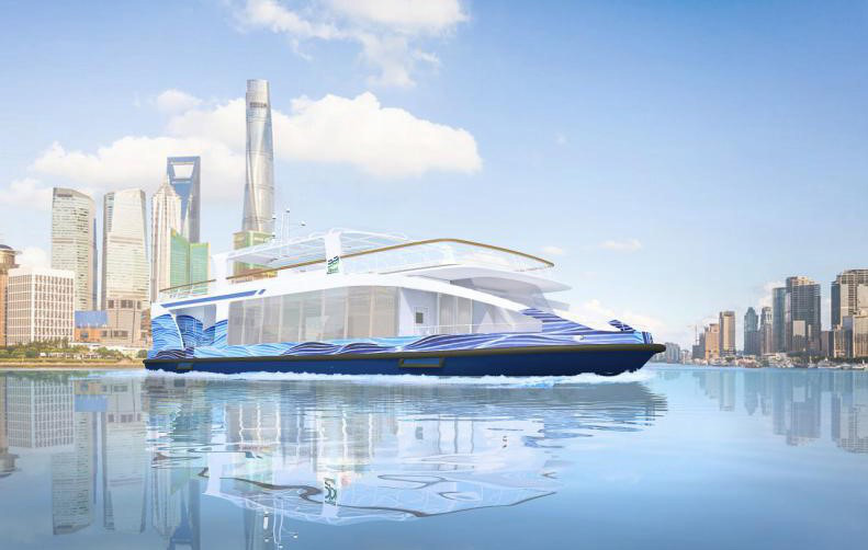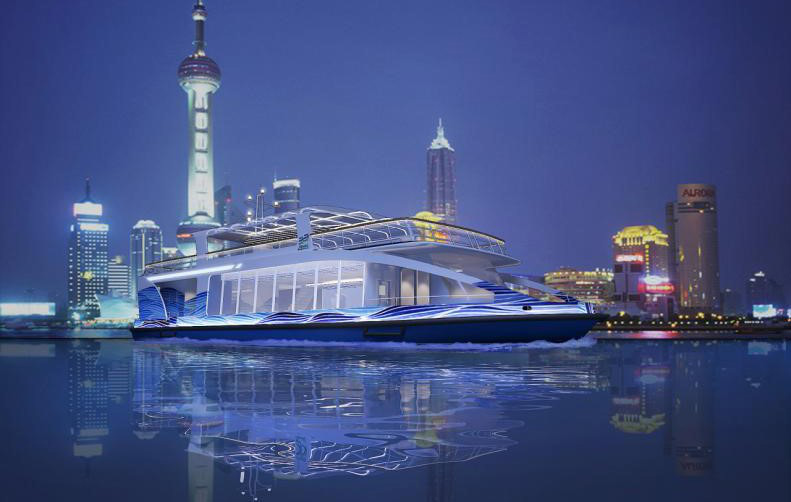 浦江“快线游”游览船共新造5艘,船舶外形一样,但外彩色涂装及内装饰风格不同。为第二届“进博会”提供专项水上游览服务。供游客多种选择。